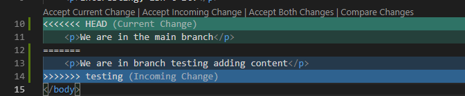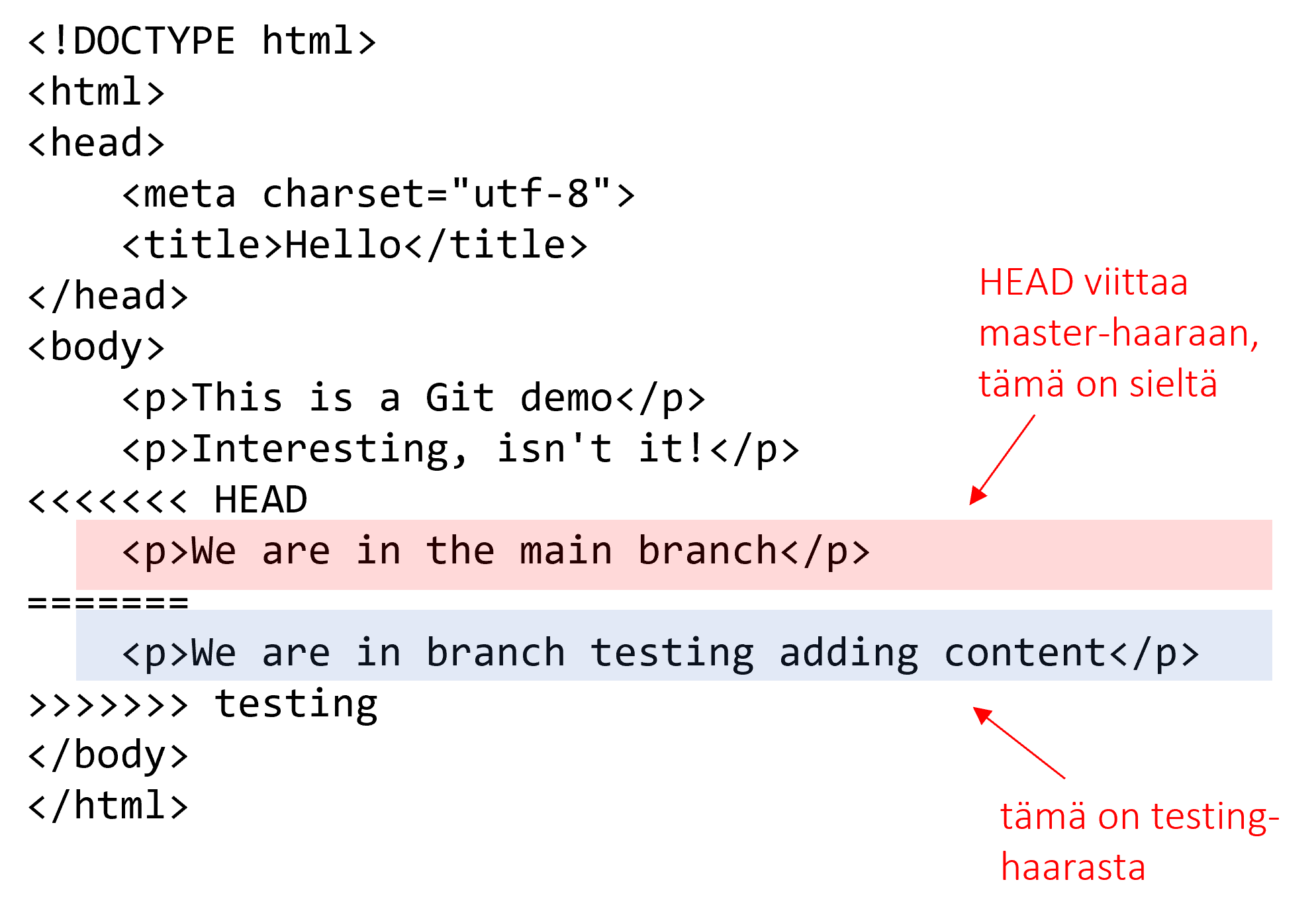 Tällöin talletus jää kesken, ja hakemistossa on konfliktin sisältävistä tiedostoista uudet versiot, joissa Git on yhdistänyt kaiken sen, mitä se automaattisesti kykeni. Git on merkinnyt ja lisännyt ristiriitakohtiin molempien haarojen muutokset.