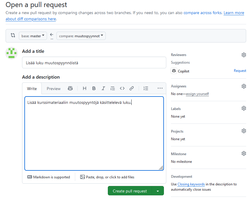 - mistä repositoriosta ja haarasta muutoksia ehdotetaan