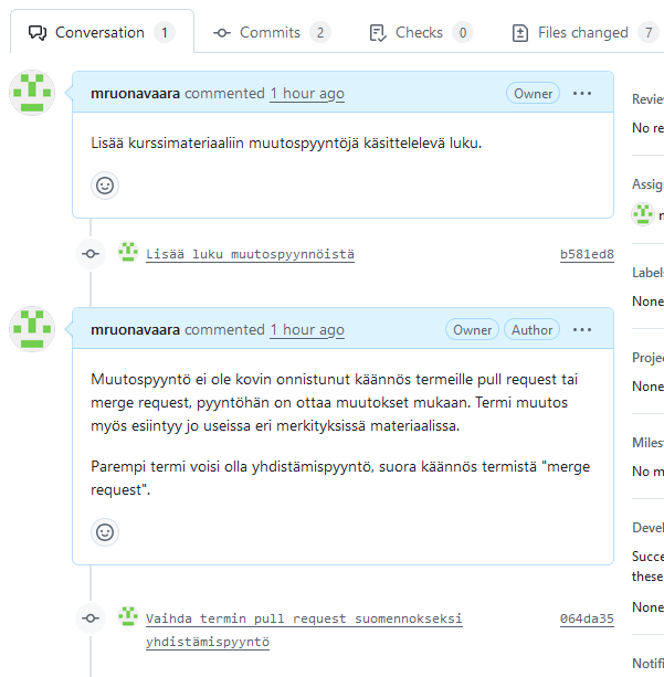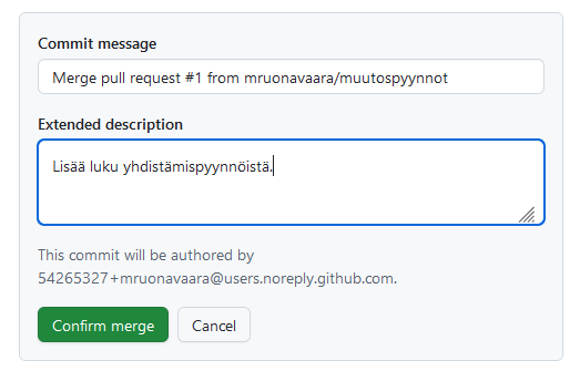 Seuraavassa esimerkissä tehdään yhdistämispyyntö GitHub-palvelussa.