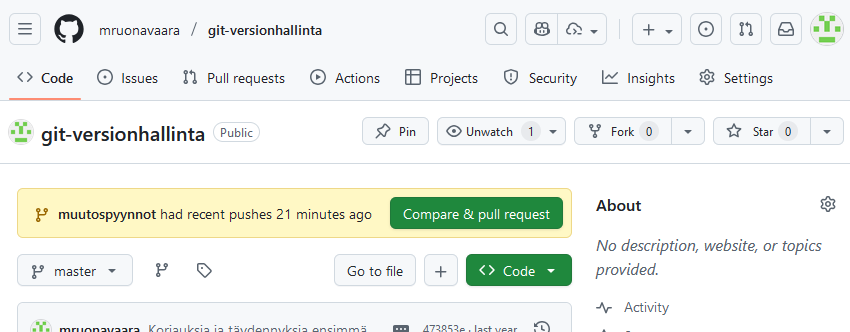 Kun haara näkyy etärepositoriossa, yhdistämispyyntö voidaan tehdä GitHubin web-käyttöliittymässä.